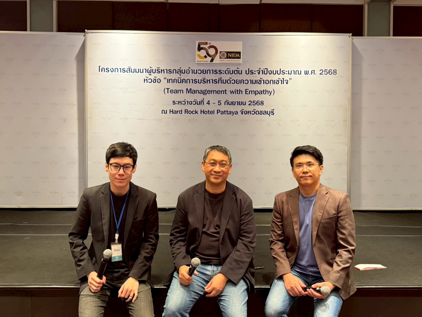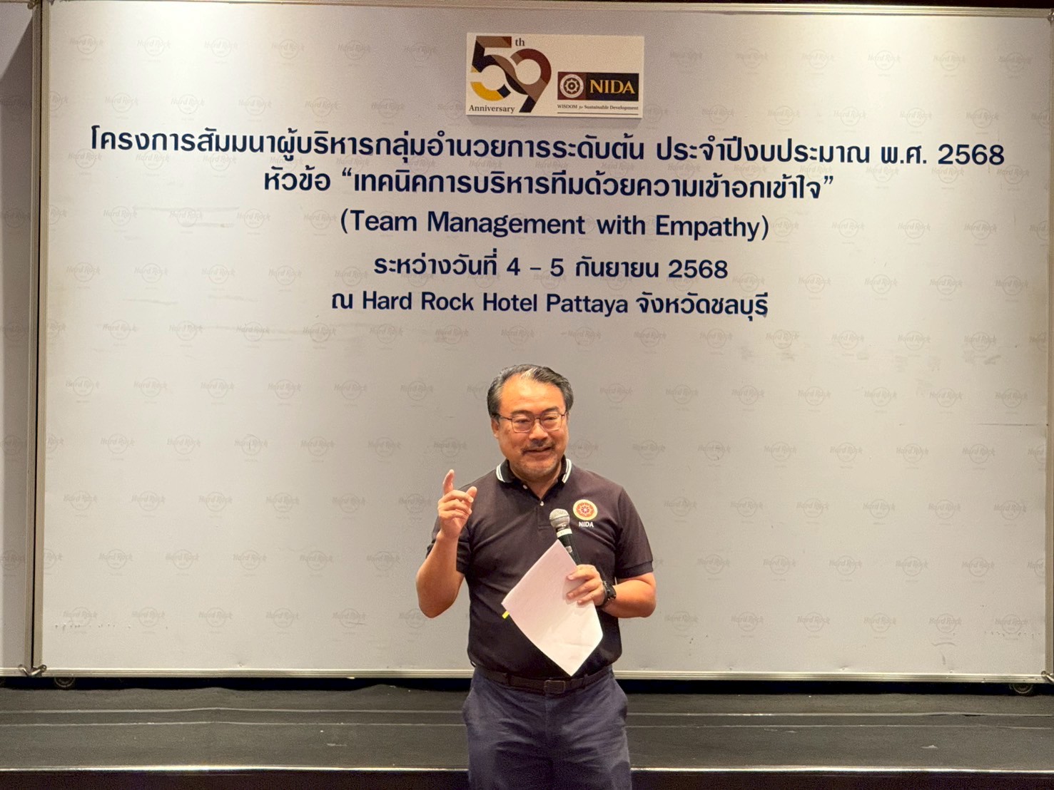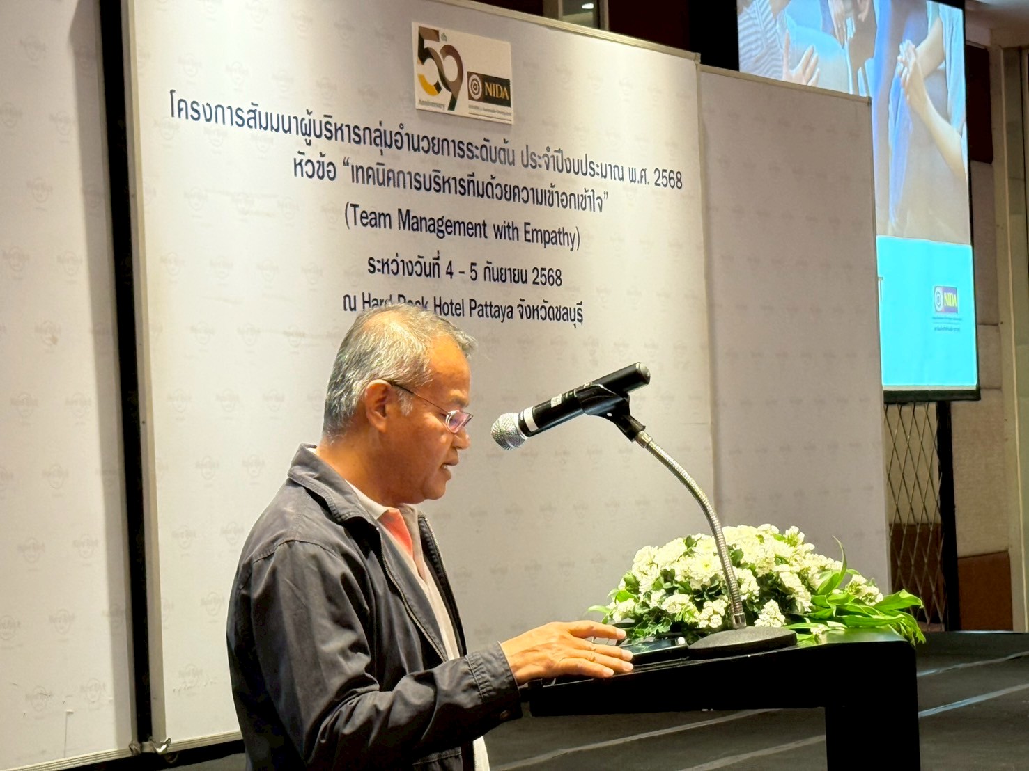 สถาบันจัดสัมมนาผู้บริหารกลุ่มอำนวยการระดับต้น ประจำปีงบประมาณ พ.ศ. 2568 ภายใต้หัวข้อ “เทคนิคการบริหารทีมด้วยความเข้าอกเข้าใจ” (Team Management with Empathy) ระหว่างวันที่ 4-5 กันยายน 2568 ณ Hard Rock Hotel Pattaya จังหวัดชลบุรี เพื่อเสริมสร้างทักษะการบริหารงานด้วยความเข้าใจและสร้างบรรยากาศที่ดีในการทำงาน สร้างแรงบันดาลใจให้ทีมงานทำงานอย่างมีประสิทธิภาพ และมีความสุขในการทำงาน นายยุทธนา สุจริต ผู้อำนวยการกองบริหารและพัฒนาทรัพยากรบุคคล ได้กล่าวรายงานวัตถุประสงค์ของโครงการ และได้รับเกียรติจาก รองศาสตราจารย์ ดร.สมบัติ กุสุมาวลี รองอธิการบดีฝ่ายวิชาการและกิจการนานาชาติ เป็นประธานเปิดโครงการครั้งนี้ พร้อมด้วยวิทยากรผู้ทรงคุณวุฒิ 3 ท่าน ได้แก่ คุณลัญชกร คำศรี คุณภัทร กิตติมานนท์ และคุณกิตติ องอาจเชาว์เลิศ ได้แลกเปลี่ยนและแชร์ประสบการณ์ในการทำงานด้วยความเข้าอกเข้าใจ ผ่านรูปแบบการเรียนรู้สุนทรียสนทนา
