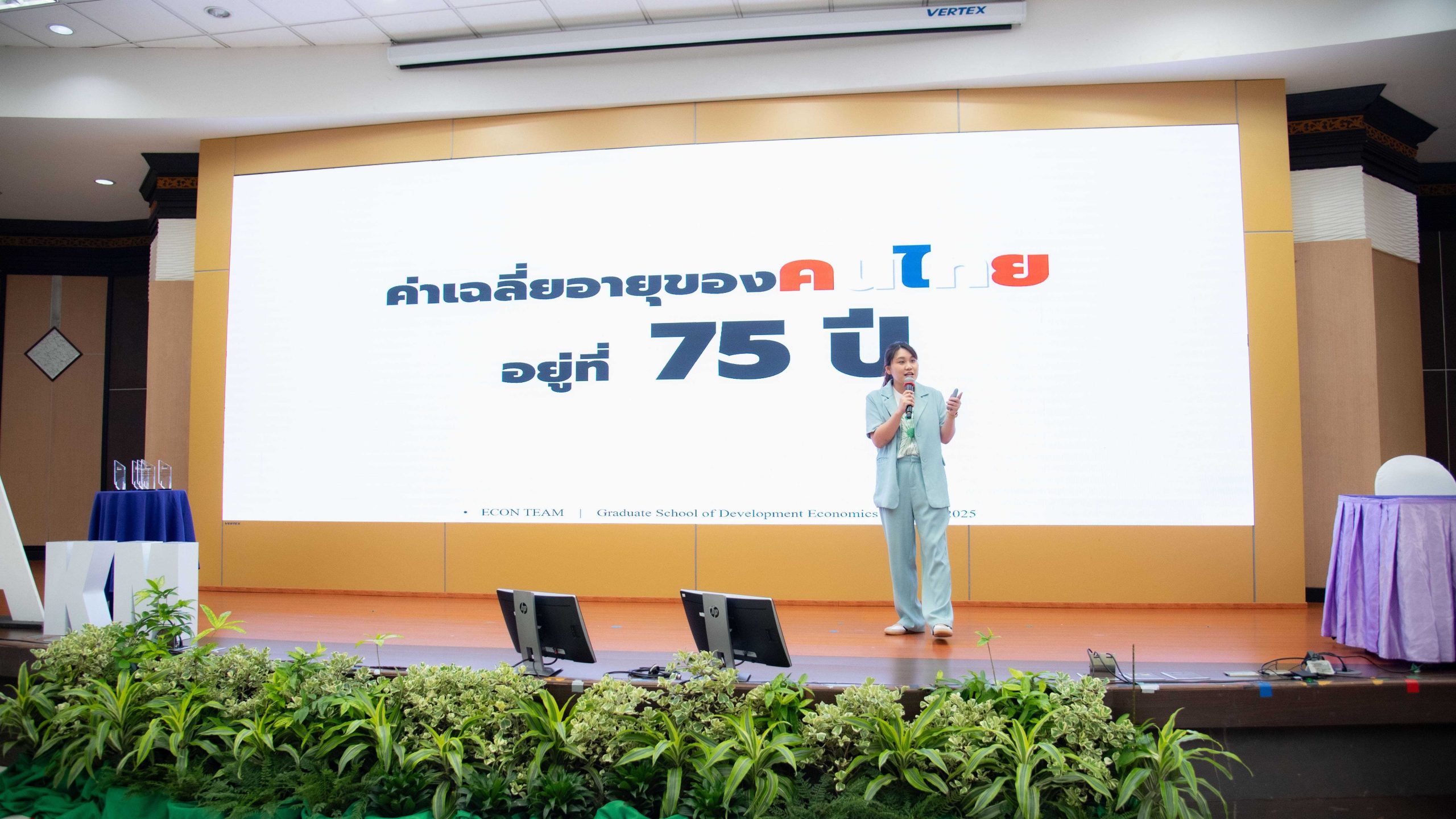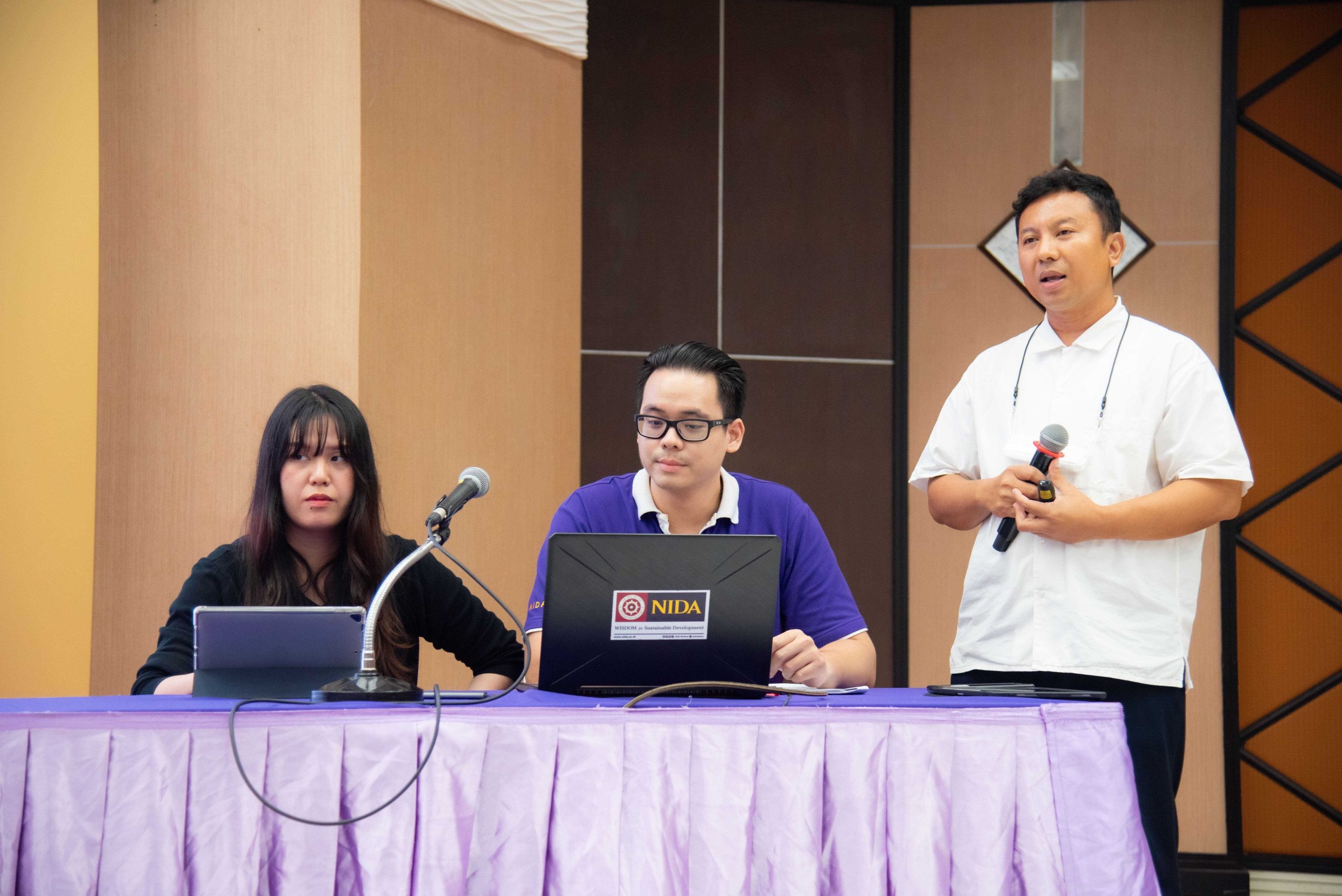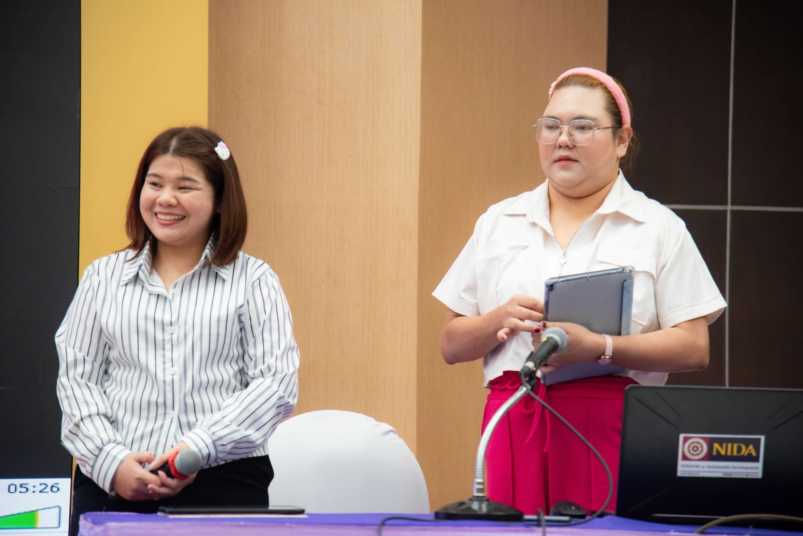 ในช่วงถัดไปเป็นการประกวดโครงการ “การพัฒนากระบวนการปฏิบัติงานเพื่อยกระดับการพัฒนาที่ยั่งยืน” ของหน่วยงานต่าง ๆ ภายในสถาบัน โดยได้รับเกียรติจาก คุณสุกิจ อุทินทุ คอลัมนิสต์กิติมศักดิ์ Sustainable Daily เดลินิวส์ คุณวรางคณา ภัทรเสน ผู้อำนวยการฝ่ายพัฒนาความรู้ด้านความยั่งยืนตลาดหลักทรัพย์แห่งประเทศไทย คุณกรณิศ ธนสุนทรกิจ รองกรรมการผู้จัดการ สายงานทรัพยากรบุคคล บริษัท ซีพี ออลล์ จำกัด (มหาชน) เป็นคณะกรรมการตัดสินผลงาน พร้อมให้ข้อเสนอแนะ คำแนะนำต่าง ๆ แก่ผู้เข้าร่วมการประกวดผลงาน สำหรับการประกวดโครงการการพัฒนากระบวนการปฏิบัติงานเพื่อยกระดับการพัฒนาที่ยั่งยืน ประจำปี 2568 มีหน่วยงานภายในนิด้าที่ได้รับรางวัล ดังนี้