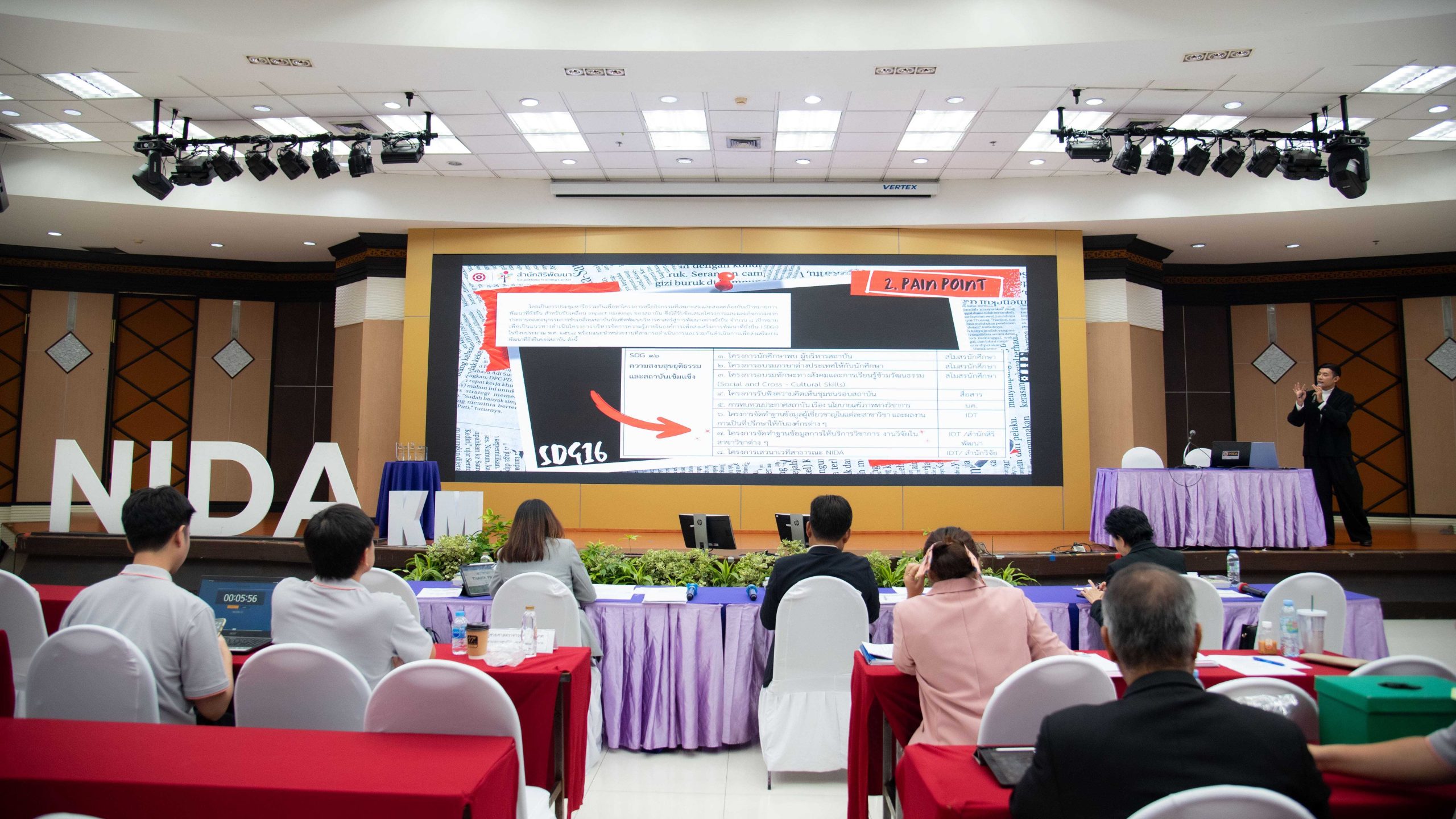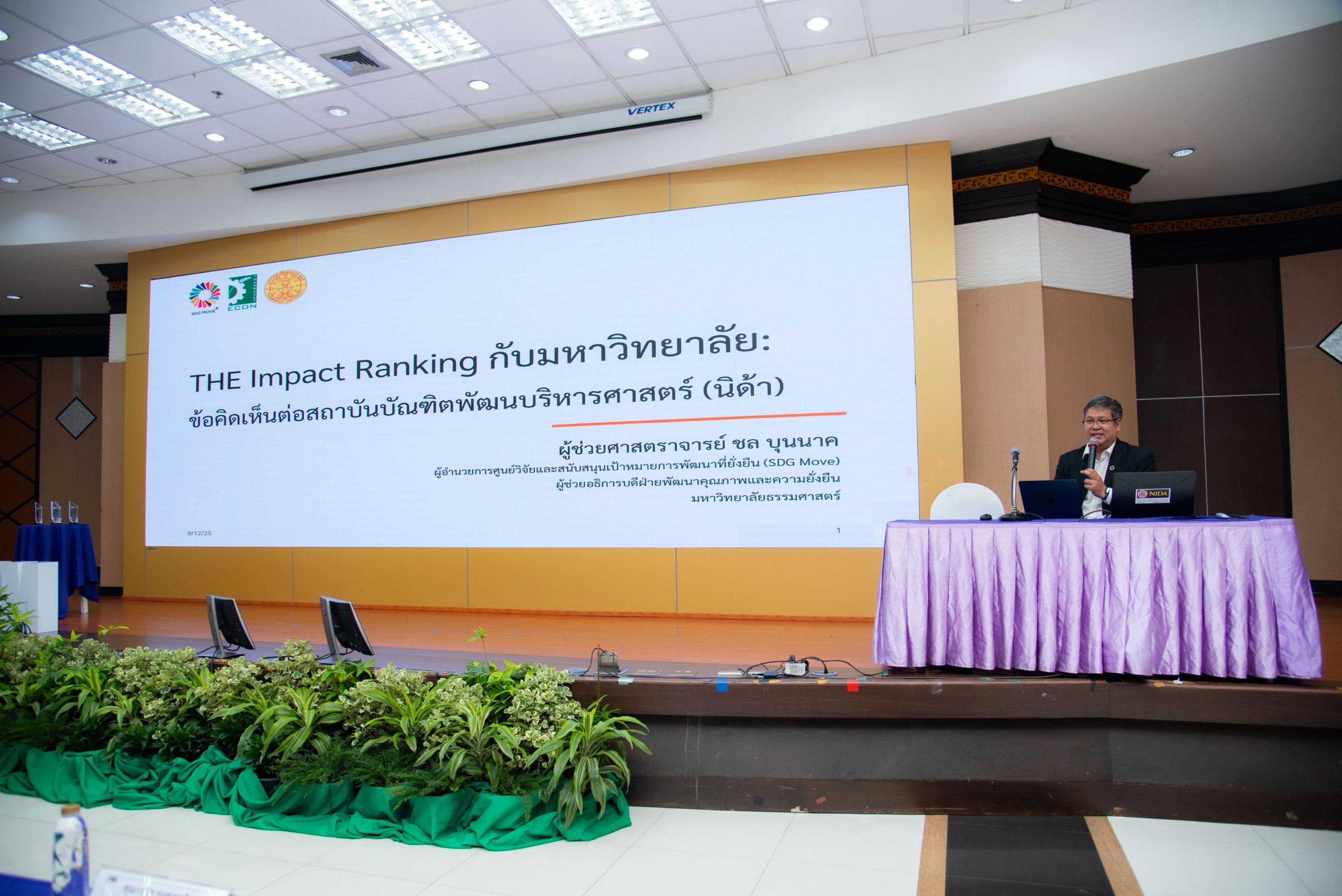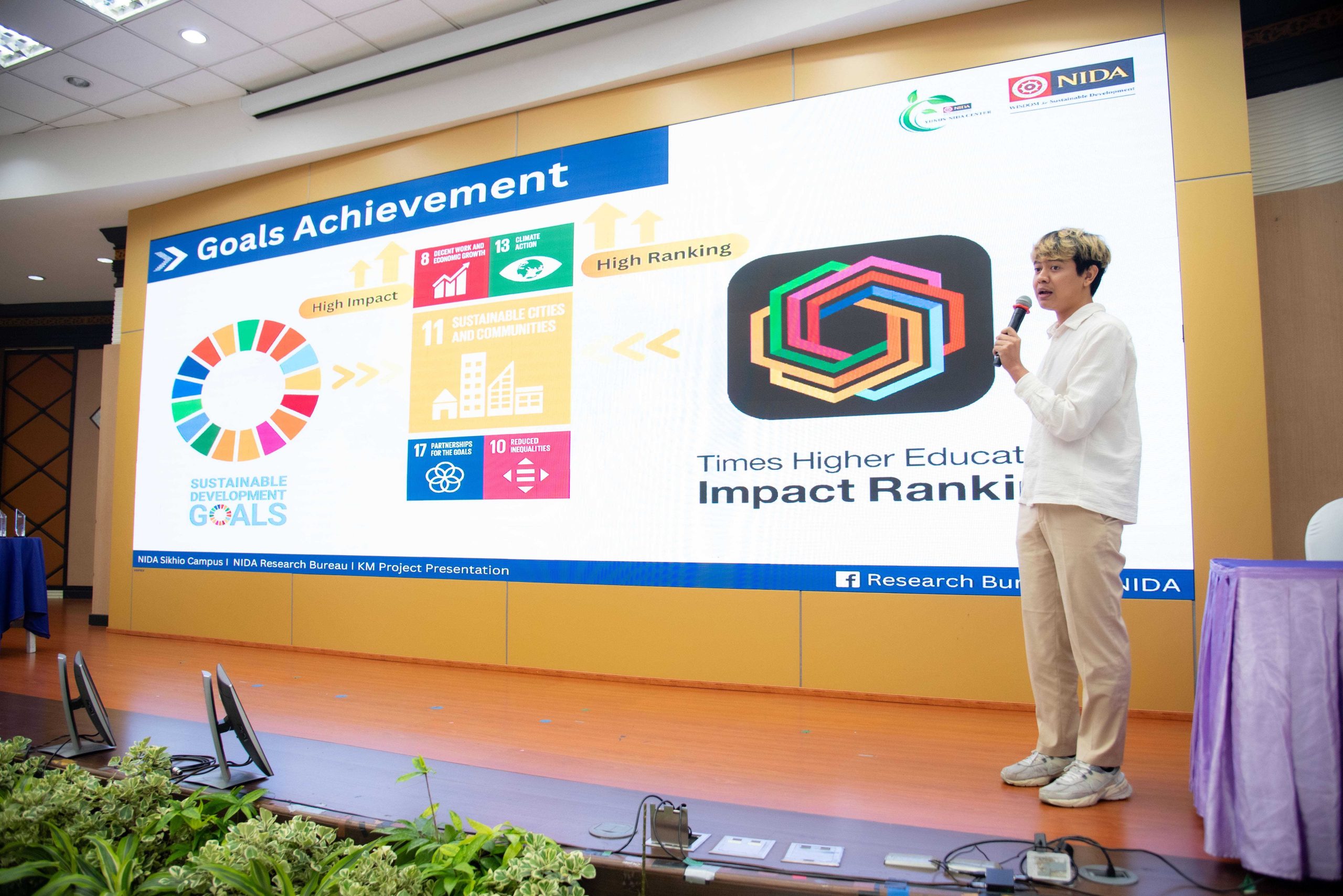 โดย ได้รับเกียรติจาก ศาสตราจารย์ ดร.ทิพวรรณ หล่อสุวรรณรัตน์ อธิการบดีสถาบันบัณฑิตพัฒนบริหารศาสตร์ กล่าวเปิดงานและกล่าวต้อนรับ วิทยากรบรรยายพิเศษ คณะกรรมการผู้ทรงคุณวุฒิ ผู้บริหาร คณะกรรมการพัฒนาระบบบริหารความรู้ภายในองค์การ คณะทำงานการจัดการความรู้ภายในองค์การระดับหน่วยงาน และผู้ปฏิบัติงานในสถาบัน ในช่วงแรก ได้รับเกียรติจาก ผู้ช่วยศาสตราจารย์ ชล บุนนาค ผู้อำนวยการศูนย์วิจัยและสนับสนุนเป้าหมายการพัฒนาที่ยั่งยืน (SDG Move) ในการบรรยายพิเศษภายใต้หัวข้อ THE Impact Ranking กับมหาวิทยาลัย : ข้อคิดเห็นต่อสถาบันบัณฑิตพัฒนบริหารศาสตร์ (นิด้า) โดยได้กล่าวถึงภาพรวมของ THE Impact Ranking พร้อมแสดงข้อคิดเห็นเกี่ยวกับปัจจัยที่ส่งผลต่อการจัดอันดับในบริบทของมหาลัย การสร้างความยั่งยืน รวมทั้งให้คำแนะนำถึงแผนการพัฒนาที่ยั่งยืนของสถาบันในอนาคต เพื่อให้สถาบันสามารถพัฒนาอย่างยั่งยืนต่อไปได้